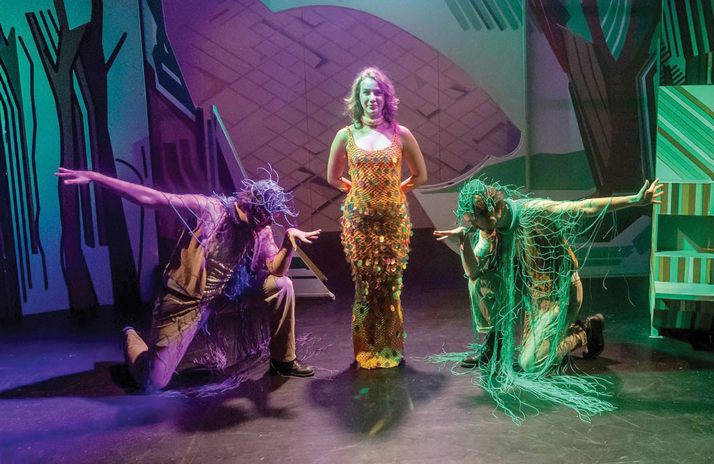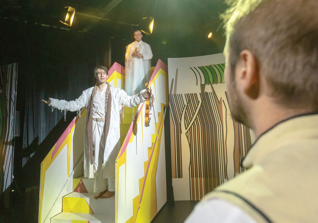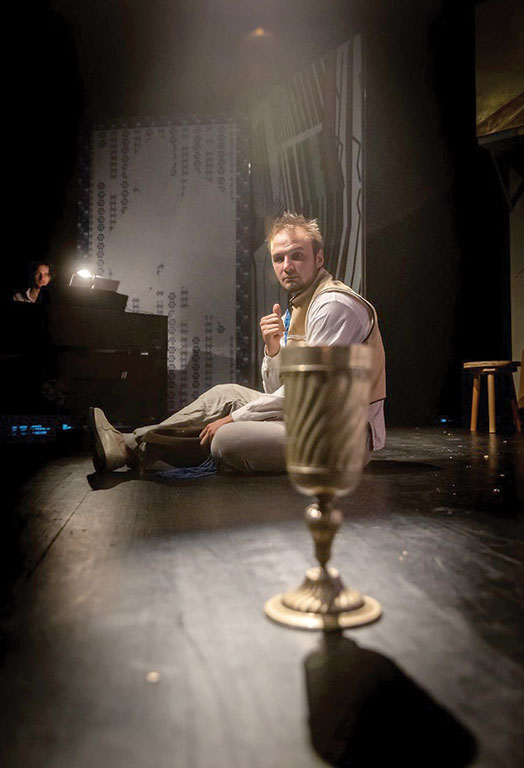 O-B. N: Igen, és most így utólag azt érzem, hogy leginkább a díszlet megtervezése során. A szöveg esetében is nagyon fontos a szimbólumrendszer megismerése és használata, de a látvány tudja egységessé tenni az előadást. Nagy Bogáta, aki a díszletet csinálta, elképzelt egy képeskönyvet. Egyik jelenetből úgy megyünk át a másikba, hogy „lapozunk”. Kicsit elrugaszkodott attól a megszokott látványvilágtól, amellyel a mesekönyvekben szoktunk találkozni, ezáltal erőteljesebb asszociációra van szükség. De én nagyon szeretem akár a halformát ebben a mesekönyvben, akár a vonalak találkozásából kirajzolódó épületeket. Emellett viszont megjelentek teljesen realisztikus kellékek is: kupa, szőlő, ezüsthíd; tehát nem végig támaszkodtunk az asszociációkra.